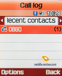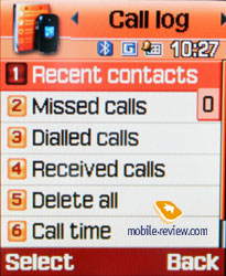Call lists. Each of the given lists contains up to 30 phone numbers. There is a combined list of all the last calls with an icon indicating a call type. Deflecting the navi-pad horizontally, you can switch quickly from one list to another. The date and the time of a call without special note of duration are displayed in extended view for separate entries. Calls from/to one number are summarized, so that a number standing next to the call specifies total amount of calls made. In order to access duration data you will need to call up detailed information on desired item. As always, the overall time of the calls and their prices can be viewed in this menu (in case the service has been enabled).