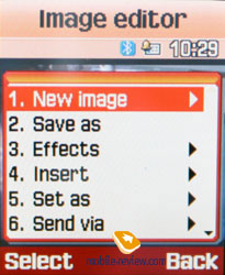 There are 5 different sounds for the shutter in the E500, excluding the silent mode, when the process of taking photos won't draw anyone’s attention. Default file name, the sensitivity of the matrix (Auto, ISO 100, ISO 200, ISO 400) are available for adjustment. I'd recommend using Auto mode since it allows getting correct settings in majority of cases. The difference between sensitivity modes is quite hard to notice in normal conditions – in fact you won't see any changes on the photo. The timer for self shooting can be set for 3, 5 or 10 seconds. The mosaic mode switches the camera to the lowest resolution (a final picture is 640 x 480 pixels) and you get a picture that consists of 4 or 9 items (2x2 or 3x3). A feature of some interest should you be willing to carry out some experiments. In the multi shot mode it's possible to select some series, in particular that may be 6 photos with high speed (practically immediate pictures), with normal speed (the period between the photos is a second or less). Also modes with 9 and 15 photos are available. I'll note that the function is interesting as a photofinish at a competition, in real life if moving the camera the photos will get blurry in the majority of cases. The resolution is 320x240 in this mode. Describing separate functions, we completely forgot to tell about switching into the shooting mode, which is done either by pressing the side button or via the menu. The screen of the phone serves as a viewfinder, using the navigation button you may change the contrast level and use zoom. When the resolution reaches the maximum level, zoom turns off automatically. The picture may be mirrored on the screen using side buttons. There is a standard set of effects in the phone that may be applied in course of either shooting or editing. As for me, the second way is more acceptable just like applying frames to the photos. We'll just list the effects here, as you may get acquainted with them in a separate archive (Black & White, Negative, Sepia, Emboss, Sketch, Orange, Aqua, Red focus, Yellow focus, Blue focus). The last three effects distinguish the main colors of the composition but the function is mediocre in most cases. The photos are kept in the album, where you may view the data on a certain photo. The list gets formed fast and indicates the phone name and a small icon. Any photo may be assigned to a contact in the phone book or set as wallpaper right from the album menu. There is a slide show mode, a basic editor that allows adding emotion icons, apply frames and effects to the photos.