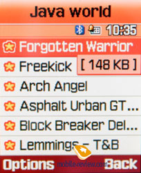 Java World. The handset carries three pre-installed games: Forgotten Warrior, Freekick, Arch Angel and a pair of Try&Buy games. Uploading of new applications can be carried out only over the air. Volume of memory reserved for Java-powered applications is 4 Mb.