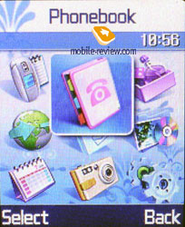 MenuThe model copies the Samsung E720 but still differs in some things. The memory capacity kept for applications is the same. 82 MB are kept for photos, multimedia. Up to 4 MB for Java applications and the max application size is 300 KB. For e-mail messages that forms 3.7 MB and separate memory is provided for MMS. The absence of memory cards doesn't seem a disadvantage for a product of this class. The main menu design is reworked specially for women, wall-papers have changed and several pictures have become different. Typically women applications appeared among functions, they will be discussed below. The main menu is represented only with a row of icons. All of them look stylish. Number navigation using number series is supported. All the submenus are lists and shifting between the submenus is possible by pressing the left or right on the navi pad. From the beginning the navi button has 4 preinstalled functions assigned (messages, melody, Bluetooth, voice dialing). In general the menu division is quite logical and navigation is not a problem.