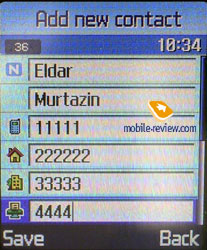 There are two fields for a Name and a Surname (search only by the first one) that are concatenated when displayed and the Name field goes the first. For example, if you entered Eldar Murtazin, it is displayed exactly in this manner. The length of each line is 20 symbols for any of the available languages. You may opt to alter the language while entering the name text as well. Files in different languages are sorted out according to a rule - first it will be all files in the local language (Russian, for example), and then those in English. This is rather convenient and habit forming. Taking into account an option of fast language change during the search, it becomes clear that the files in different languages do not impede the work with this phone.