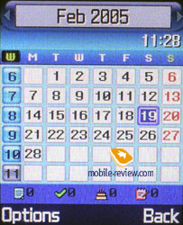 Organizer. Up to 400 events of four types - meeting, affair, anniversary and others, can be saved in the phone's memory. The day and the time as well as its end are indicated for each file. A signal can be set for the interval during which it has to go off; repetitive events are available for setting.