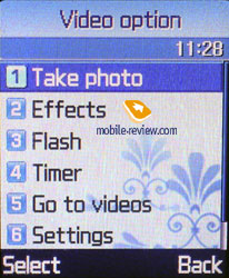 The device supports such effects as Gray scale, Negative, Sepia, Emboss, Sketch, Antique, Moonlight, Fog. Samples of various effects applied to photos taken indors, zip-archive, 1.31 MB. Frames are supported for 320x320 pixels photos, new ones may be uploaded. Flash can work automatically or be set manually. Timer may be set for 3, 5 or 10 seconds. Also there is a possibility to take 6, 9 or 15 photos in a series; you can set two types of speed for each case (normal and high). Finally, the device supports matrix photos (2x2, 3x3). The same set of effects is provided when recording video. Four resolutions are supported- 352x288, 320x240, 176x144, 128x96 pixels. The quality may be set just like for photos (four levels). The video looks not bad on the screen; you can also switch sound off. You are not limited in clip duration, write as long as free space allows.