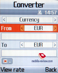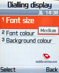 Files and folders can be viewed either as a list or as thumbnails. You can select any amount of files. The handset supports Move, Copy and Delete operations, as well as various types of sorting (by type, name or size) Memory card’s file structure is a slightly different story, as it can be accessed through the main menu, where each item features “Memory card” option. Settings. This item boasts a standard set of options inside - font color in the standby mode, password protection of selected sections (messages, short messages, organizer, etc.), backlighting duration and brightness, dialing display. Calling up Security item allows protecting certain functions and menus with password.