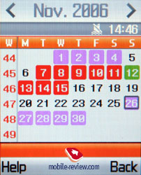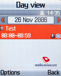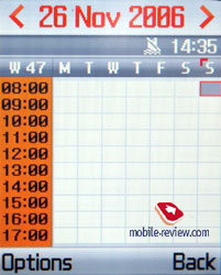 SOS Message is a new feature to the Samsung’s arsenal – here you need to submit telephone numbers that will receive messages with user-customizable text. To send such message all you have got to do is press the side key four times. However how useful this function is in light of missing GPS-receiver and coordinates tracking, is a big question; generally speaking, it’s nothing more but an addition to Mobile Tracker. Planner. There can be up to 300 different events of three types (3x100) - meeting, affair and anniversary. The day and the time as well as end time of the even are indicated for each entry. Alert signal, as well as its duration can be adjusted according to your liking; repeatable events are available for setting up (at that repetition time is also adjustable as well as exclusion dates). The weekly and the monthly calendar views are very convenient with each type of the event having its own color.
