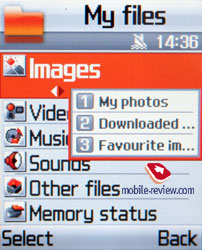 File Manager (My files). That’s the place to search for all files such as music, pictures, video and sounds. Any uploaded file gets stored here. The disadvantage is that files sometimes are not displayed in the list immediately - in that case you will need to leave the menu and enter it again.