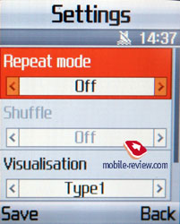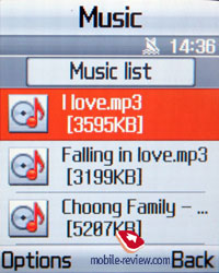 The title of the played back track is displayed as well as the number of the remaining tracks. The equalizer doesn’t make much sense, as there is no precise adjustment of audio controls (only a possibility to choose from classic, rock, jazz and normal sounding). The tracks can be played through the stereo headset as well as through the speakerphone (A2DP profile is missing in the handset). The volume bar has 10 scales on it. And of course user can make up playlists of his own. Player can work in minimized mode.