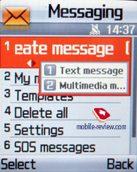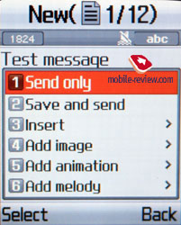 MMS. Interface for creating multimedia messages is pleasant to use, you can instantly save them in different folders. There is limitation for a message size (295kb), meanwhile incoming messages are not limited at all (though they may take up not more than the reserved memory volume). As for additional settings – there is option to disable advertisement reception, select weather messages be received during roaming or home network stay. Messages are stored in a separate memory block (3 Mb)
