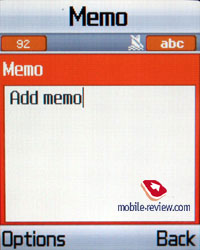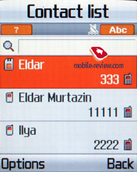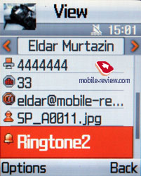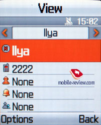 There are two lines for First Name and Last Name (search is conducted only by first field), fields get summed when displayed, Name comes first. For example Eldar Murtazin will be shown only in this order. Length of each field is 20 characters for any supported input language. You can also switch languages on the go when entering a name. All entries, without regard to language, are sorted out under the algorithm – all contacts with headings made in a local language (Russian, for example) go first and then those with names in English. This is rather convenient and handy list sorting system. Taking into account fast language switch option during the search, it’s clear that no language will spoil the experience of working with this phone. But let us return to the information entered for a contact. Apart from phone numbers, e-mail address (there may be several of them), a little text memo can be submitted on top of all that. Any music file as well as composed MP3's can be picked as a ring tone for a contact. Three caller groups are provided by default with the possibility for creating any number of additional groups, selecting a personal melody and image for each. SMS alerts are also customizable.