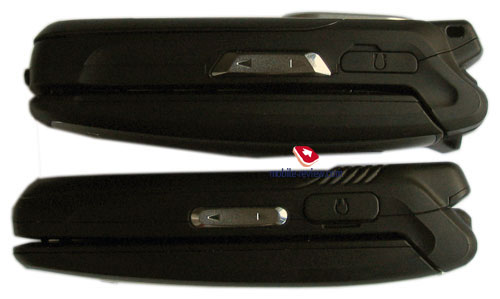 A headset connector is on the left side surface, it's closed with a shutter fixed to the body. A coupled volume button is below. A camera button is on the right, like the E750 it's ribbed and a la metallic.