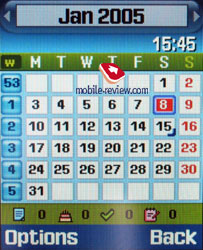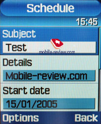 Mail client. POP3/SMTP boxes and several accounts are supported. Besides the title downloading, the phone can receive the letter itself. As for attachments, only the graphic files (GIF, JPEG) are supported. A restriction put on the attachment size is 300 KB, which prevents from sending max or mid resolution photos, though when sending a letter you can attach photos taken with the integrated camera. There is also an option of creating templates. General functionality of the mail client is not ascetic though also not the richest one. Organizer. Up to 400 events of four types - meeting, affair, anniversary and others, can be saved in the phone's memory. The day and the time as well as its end are indicated for each file. A signal can be set for the interval during which it has to go off; repetitive events are available for setting.