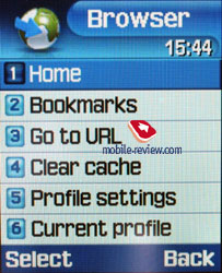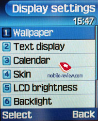 The Li-Ion 800mAh battery is also the back of the phone. According to the manufacturer, the device is capable of up to 8 hours of talk time and up to 240 hours of standby time. In Moscow networks the device worked for 3 days in case of 30 minutes of talks. In general, the model can work for 2-3 days, which is typical for this class by Samsung. Complete recharging takes a bit more than 1.5 hours. MenuThe device is an ideological copy of the current models, for instance, Samsung E720. The main menu has only one representation of rows of icons. Number navigation is available. All the submenus are vertical lists, the second menu level allows moving along the lists by horizontal deviations. Own functions may be selected from the list to assign to the navi pad. Generally, the menu is quite logically designed, and navigation makes no troubles.