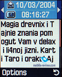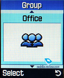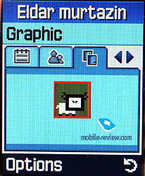 The separate contact can be assigned with custom picture, it can be either preinstalled image (for example – rich set of funny humans), or a photo, which was done by you. Of course you can bind custom ring tone, this is out of the question. On the whole the organization of contacts viewing is different from standard Samsung models, here the movement via bookmarks in horizontal projection is used. This realization is typical for several LG phones. Messages. This phone supports EMS, and joined messages as well (up to 918 symbols). As a result we get a set of small pics (22 of them), animations (24 of them) and little melodies that can be implied in the message’s body. Phone’s memory can store up to 200 messages besides SIM-card’s memory (20 more). ![]()