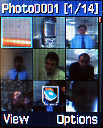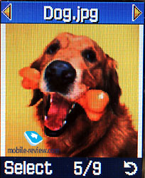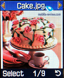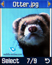 Camera. The phone has VGA-camera on board, and its main functions are available from the shooting mode (when the picture is refreshed in live mode). You can setup the picture’s contrast level, zoom the picture (8x digital zoom), or change its resolution. The standard functions on board are: timer, frames (rich collection, some of them are nice), effects (negative, sepia, grayscale, poster). This phone supports MultiShot function, there are two speeds available: normal and fast. While using either of these series 6, 9 and 15 pictures can be made. ![]()
