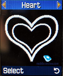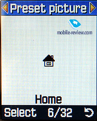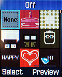 Call list. Everything is traditional here; we get a list of received, dialed and missed calls with date and time stored for each entry. Each list can store 20 entries. The call timers lack the common time of incoming and outgoing calls even though there is a separate timer for each. Sounds The phone has 64-tone polyphonic ring tones, it sounds rather nice. There are several ring tone types, including ring tone only, vibrating alert only and the vibrating alert followed by the ring tone one. Other settings are standard, it’s a choice for the SMS alarm tone, MMS alarm tone, setup of minute beep during the talk, silent mode (vibrating alert only or nothing at all). Settings. This menu allows setting up welcome message; however the display settings deserve a bigger attention. For example you can setup an animation for your wallpaper (the phone has 5 preinstalled ones). The font's style in the stand by mode can be customized as well. ![]()