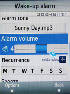 Во время просмотра страниц на экране есть 2 стрелки, с их помощью можно перемещаться по странице. Удобство такого решения сомнительно, модель не слишком хороша для просмотра сетевых ресурсов, несмотря на довольно мощный браузер, положенный в основу этой функции. ![]() БудильникВ телефоне всего пять будильников, каждый можно выставить на определенные дни недели. Для всех есть выбор из 5 мелодий, но можно использовать и mp3. В настройках можно указать, будет ли телефон включаться автоматически при наступлении события или нет.