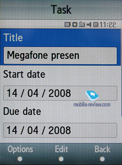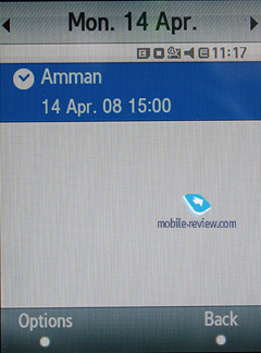 К серьезным недостаткам органайзера относится тот факт, что при вводе даты и времени события время окончания остается установленным по умолчанию. У других производителей эти параметры меняются автоматически (по умолчанию дело занимает один час времени). Эргономика органайзера из-за этого серьезно страдает. ПриложенияFM-радио. В памяти аппарата можно сохранить до 20 радиостанций, диапазон доступных частот – от 87.5 МГц до 108 МГц. Есть автоматическая настройка всех станций, но для отдельных каналов нельзя назначить свое имя, они всегда отображаются в виде частоты, цифр. Радио работает и в режиме громкой связи, плюс есть возможность назначить радиосигнал в качестве будильника, при этом гарнитура должна быть подключена, так как она играет роль антенны. Реализация радио нормальна, не все радиостанции аппарат принимает хорошо, но в целом все на нормальном уровне, сравнимо с телефонами других производителей. Радио работает в фоновом режиме. Функция RDS показывает только заголовок радиостанции в общем списке вверху, других назначений у данной опции нет.