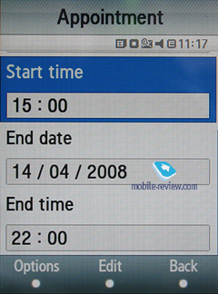 ![]() ОрганайзерВ памяти телефона можно сохранить до 100 событий, это один тип событий – встреча. Существуют и другие, например, годовщина, праздник, таких записей может быть до 100 (2х50). Список задач также содержит до 20 записей. Для каждой записи устанавливается время и дата события и указывается время его окончания. Можно выставить сигнал и интервал, за который он сработает, есть повторяемые события (причем настраивается время повтора, указываются исключения, это удобно). Просмотр календаря за месяц и неделю реализован удобно, каждый тип событий имеет свой цвет, все наглядно.