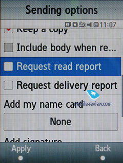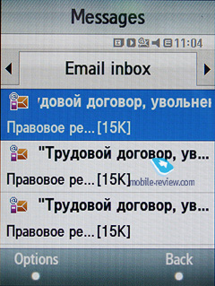 Для отдельных номеров можно вести черный список, тогда звонки с них не будут приниматься. Тут же есть список последних номеров, с которых получены SMS-сообщения или отправлены на них (два таких списка), сюда же вносятся и использованные вам адреса электронной почты. СообщенияАналогично другим производителям в Samsung отказались от искусственного разделения сообщений на SMS/MMS, вы создаете сообщение, и уже в зависимости от его содержимого оно трактуется как SMS либо MMS. В меню осталась опция, позволяющая в принудительном порядке переключить сообщение в MMS (например, вам нужно отправить только текст, но на электронную почту, минуя встроенный почтовый клиент). В памяти телефона может храниться до 500 сообщений, аппарат поддерживает стандарт EMS, совместим с Nokia Smart Messaging. При отправке можно выбрать имена как из телефонной книги, так и из списка последних использованных либо из групп. Традиционно присутствует возможность ведения черного списка для всех видов сообщений, тогда любые сообщения с указанных номеров будут автоматически удаляться. Есть возможность переносить сообщения в свои папки. Для электронной почты блокировка возможна не только по адресу, но и по теме сообщения. Существует ограничение на размер MMS-сообщения в 295 Кб, а размер принимаемого сообщения не ограничен. Из дополнительных настроек надо отметить возможность отклонения рекламных сообщений, выбор типа приема сообщения в роуминге и в домашней сети. Сообщения сохраняются в общей динамической памяти, то же и для электронной почты.