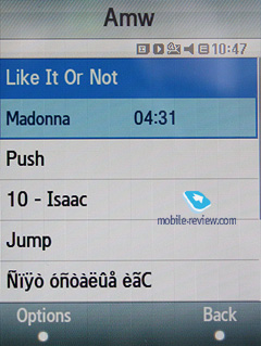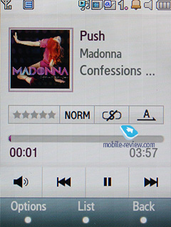 Во время проигрывания показывается номер текущей песни, общее число композиций. Эквалайзер есть, но нет никакой возможности для его настройки. Проигрывание может идти как через стереогарнитуру, так и через громкую связь. Громкость имеет 14 градаций. Пользователь может создавать свои плей-листы. Плеер работает и в фоновом режиме. В этом случае на экране отображается название композиции и подсказка к управляющим элементам, что приятно.