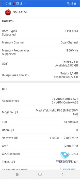 Память, чипсет, производительностьВ Samsung использовали чипсет MediaTek Helio P65 MT6768 (технорма 12 нм), в нем два ядра Cortex A75 с частотой до 2 ГГц, 6 ядер Cortex A55 с частотой до 1.7 ГГц, графика Mali G52 MС2. Производительность этого решения заметно ниже, чем у чипсета Exynos 9611, что используется в Galaxy A51 - там лучше графика, лучше отдельные ядра и у них выше частота, также техпроцесс 10 нм. Тип встроенной памяти eMMC, она не самая быстрая, но посмотрите на результаты бенчмарка.
