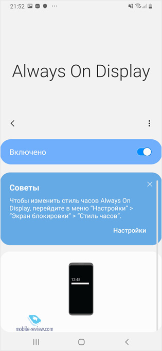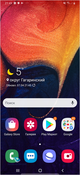 Отличие от флагманов в том, что у дисплея меньше пиковая яркость, ниже разрешение. Но в остальном это экран с возможностями, которые до появления Galaxy A30/A50 были недоступны массовому потребителю за такие деньги. Это одна из ключевых особенностей устройства, экран тут превосходит конкурентов на голову и при этом обеспечивает продолжительную работу батареи, о чем мы поговорим позже. Другой особенностью, недоступной конкурентам, становится AlwaysOn Display, это возможность видеть на экране часы или заставку, иконки уведомлений и быстро переходить в приложения.