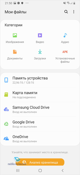 В повседневной жизни этот аппарат работает порядка двух дней при автоматической регулировке яркости подсветки (алгоритм подстраивается под вас, и он совсем не агрессивный, яркость всегда комфортная). При этом время работы экрана составляет около 7-7.5 часов. В Samsung поставили хороший экран, производительный чипсет и добились продолжительного времени работы. Понятно, что все зависит от вашего профиля использования телефона, тех программ, что у вас стоят. Но посадить этот аппарат в течение суток при активном использовании практически невозможно. Полное время зарядки батареи составляет около 75-80 минут. То, что аппарат выносливый и долго работает, это еще один его плюс. Память, чипсет, производительностьВ Samsung использовали чипсет Exynos 9610 (технорма 10 нм), в нем четыре ядра Cortex A73 с частотой до 2.3 ГГц, четыре ядра Cortex A53 с частотой до 1.7 ГГц. Производительность этого решения для сегмента отлична, интерфейс работает быстро и плавно, сторонние приложения также быстры. В Samsung решили пойти ва-банк и не только не экономить на экране и чипсете, но создать работающую связку, сделать так, чтобы модель имела продолжительный жизненный цикл и при этом потребитель не испытывал никаких неудобств. Поэтому не стали экономить на памяти, она быстрая.