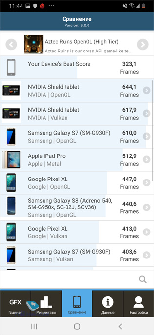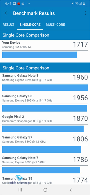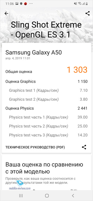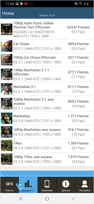 На рынке есть два варианта Galaxy A50 – 4/64 ГБ базовый, а также 6/128 ГБ для тех, кто хочет модель чуточку быстрее. Посмотрите на результаты синтетических тестов для каждого из аппаратов. Результаты тестов для варианта на 4/64 ГБ: