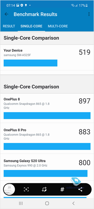 Память, чипсет, производительностьВ Galaxy A52 использовали чипсет Snapdragon 720G (технорма 8 нм), два ядра Cortex A-76 с частотой до 2.3 ГГц, 6 ядер Cortex-A55 с частотой до 1.8 ГГц, графика Adreno 618. Чипсет можно назвать относящимся к верхней части среднего сегмента, он производительный и при этом довольно экономичный, что выливается в хорошее время работы. В синтетических тестах нет каких-либо сверхдостижений, посмотрите на результаты.