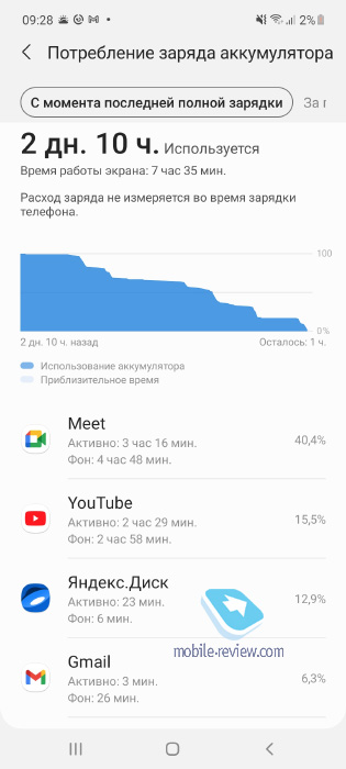 На солнце экран остается читаем, яркости хватает для любой работы. Диагональ экрана идеальна для того, чтобы смотреть видео, просматривать фотографии, читать тексты. Это универсальный смартфон, и то, что здесь настолько хороший дисплей, выделяет его среди всех конкурентов. АккумуляторВ смартфоне встроенная Li-Ion батарея емкостью 4500 мАч, она поддерживает быструю зарядку, и в комплекте идет зарядное устройство на 15 Вт. Беспроводной зарядки нет, но для этого сегмента это нормально. Минус в том, что наилучший результат показывает зарядка на 25 Вт, но ее придется купить отдельно. С ней вы можете зарядить аппарат за 75 минут до 100%, а вот комплектная зарядка будет заряжать его порядка 125 минут. Заявленные официально параметры работы батареи совпадают с тем, что мы получили в тестах. В повседневной жизни этот аппарат работает порядка двух дней при автоматической регулировке яркости подсветки (алгоритм подстраивается под вас, и он совсем не агрессивный, яркость всегда комфортная). При этом время работы экрана составляет около 7-8 часов. В моем случае с кучей видеоконференций получаю обычно 6-7 часов работы или около того. Для тех, кто хочет выжать чуточку больше, легко достижимы 10-12 часов работы. Что для этого сегмента выглядит очень и очень хорошо. Хотя тут все напрямую зависит от того, чем и как вы пользуетесь на смартфоне.