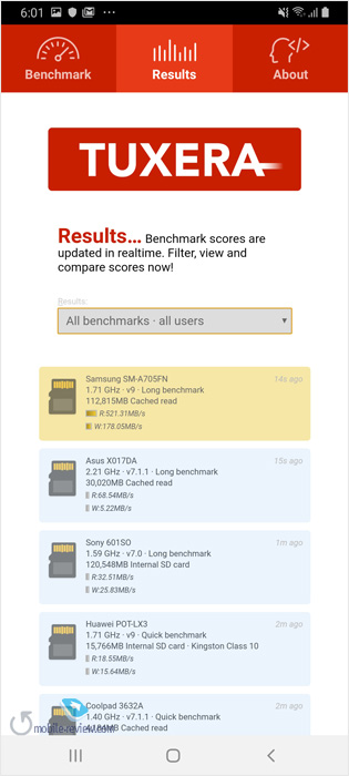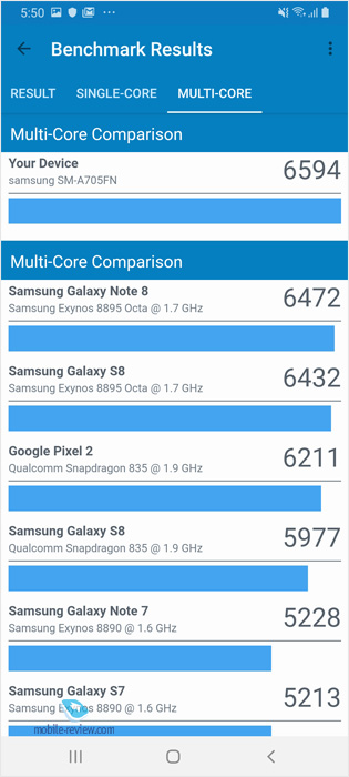 У каждого свой профиль работы, свои приложения. И если в А50 с батареей 4000 мАч и чипсетом Exynos достижимо было порядка двух дней работы с экраном в 7-7.5 часов, то тут показатели подросли. Два с половиной, даже три дня аппарат может проработать при спокойном использовании, если вы не нагружаете его играми, у вас обычный набор софта. Для тех, кто нагружает аппарат, это может быть 1.5-2 дня, игроки смогут посадить аппарат примерно часов за десять, что также своего рода рекорд, памятуя о диагонали экрана. Очень выносливый, долго работающий. И это большой плюс для модели. Память, чипсет, производительностьВ аппарате 6 ГБ оперативной памяти, 128 ГБ встроенной. Это очень неплохо, и в теории можно даже не ставить карту памяти, хотя она тут может быть до 512 ГБ. Скорость работы памяти отличная, что дает неплохие результаты в связке с чипсетом. Это быстрый смартфон, и в своем классе он показывает хорошие результаты – никаких тормозов нет. Посмотрите на результаты синтетических тестов.