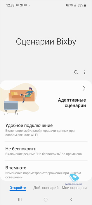 Стандартные приложения представлены калькулятором, менеджером файлов, диктофоном и другими приложениями, которые необходимы для комфортной работы из коробки. Тут также есть сценарии Bixby, очень классная штука, которой пользуюсь постоянно. Но чтобы увидеть все возможности, прочитайте обзор OneUI 3.1.