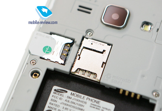 Открываем заднюю крышку, внутри - аккумулятор и два разъема для microSIM-карт (в моделях на одну карту, второго слота нет, вместо него заглушка), а также разъем для microSD.