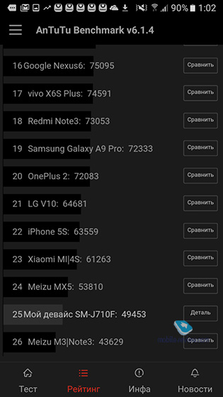 Но как только вы вспомните, что цена на А7 2016 года – около 30 000 рублей против 20 000 за J7 2016, все встанет на свои места, это устройства разных классов. И если вы готовы поступиться дизайном, то получите примерно те же возможности плюс беспрецедентное время работы. Конкурентов на рынке фаблетов хватает, есть на что посмотреть и что выбрать. Например, можно обратить внимание на Meizu M3 Note, этот аппарат производителен, у него есть хороший экран, хоть и IPS, сканер отпечатков пальцев, он просто выше классом, пусть и на Android 5.1.1 с фирменной оболочкой. При цене в 17 000 рублей он выглядит интереснее, но несмотря на батарею в 4100 мАч, работает меньше во всех режимах. Это один из лучших аппаратов в классе фаблетов от китайцев.