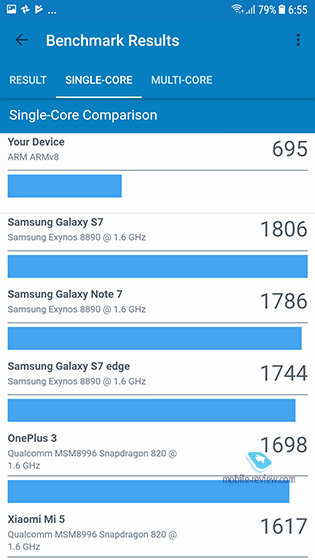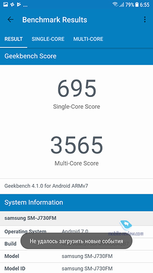 Чипсет, память, производительностьЧипсет в этом аппарате Exynos 7870, у него 8 ядер с частотой до 1.6 ГГц, он достался аппарату по наследству от J7 2016 года. Производительности для обычных задач хватает за глаза, интерфейс отзывчивый и довольно быстрый (не как у флагманов, но в своем сегменте все работает отлично, нареканий нет). У аппарата 3 ГБ оперативной памяти, 16 ГБ встроенной (доступно изначально 10 ГБ). На мой взгляд, для этого сегмента и сценариев использования 3 ГБ оперативной памяти более чем достаточно. Карты памяти до 256 ГБ, причем нет ограничений на карту памяти и две SIM-карты, это важно. Посмотрите на результаты синтетических тестов, они типичны для такого устройства.