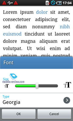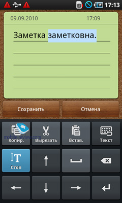 The second application is Navifon, which is good in ordinary phones where you cannot use fully functional navigation apps and its presence in Samsung Galaxy S is strange, but it is better than nothing. Back to the table of contents >>> Text inputIn Samsung Galaxy S the text input can be carried out through a popular Swype keypad. What is it? In the world of screen keypads Swype for Android is like Natural Ergonomic Keyboard 4000 for blind typing. In other words Swype has it all, but it is still not the most convenient keypad for Android. Especially when you start using Russian and the letters seem narrow and difficult to touch correctly at least from the start. You have to get accustomed.