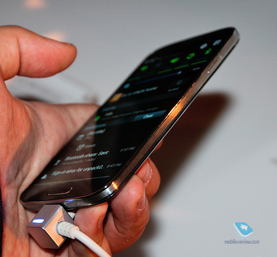 Дизайн, размеры и первые впечатленияНикаких ярких изменений в дизайне флагмана не произошло, это примерно тот же вид, что у Galaxy S3, Note II и десятка аналогичных моделей компании. Обидно? Возможно. Но это покупают миллионными тиражами, и почему вопрос дизайна решили так, я рассказывал вот здесь. Многие ожидали, что при росте диагонали экрана до 4.99 дюйма увеличатся размеры аппарата по сравнению с Galaxy S3, но он стал тоньше и чуточку уже. Учитывая, что все иные характеристики, включая батарейку, улучшились, то за это можно похвалить компанию. И тут же поругать ее за то, что она пытается решить проблему пластика, которая надумана, придумыванием иных ипостасей. Так, на презентации рассказали о том, что корпус очень надежен, так как выполнен из поликарбоната (это просто один из видов пластика, и только). Начиная с Nokia N9 поликарбонат используется в ряде моделей Nokia, но там совсем иная конструкция – она более массивная. Это все равно, что сравнить пластиковый пакет и что-то более массивное, но сделанное из того же пластика. Вроде как, одно и то же, но результат разный.