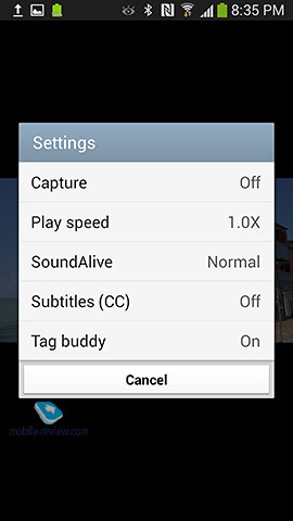 Музыкальный плеерНикаких серьезных изменений нет, кроме того, что появилась пара дополнительных фишек, которые придутся по вкусу тем, кто слушает подкасты. Во-первых, добавилась возможность менять скорость воспроизведения любого звукового файла. Во-вторых, можно установить автоматическое время отключения проигрывания музыки. В третьих, есть настройка «Мой звук», в которой аппарат анализирует, как вам нравится слушать музыку (громкость, эквалайзеры и так далее). Функция Smart Volume приводит все композиции к общему знаменателю по уровню громкости. Музыкальный квадрат никак не изменился (возможность выбрать визуально композиции с разным ритмом и настроением и добавить их во временный плейлист). Число различных кодеков максимально – об этом надо внимательно поговорить в полноценном обзоре.