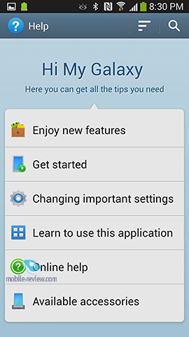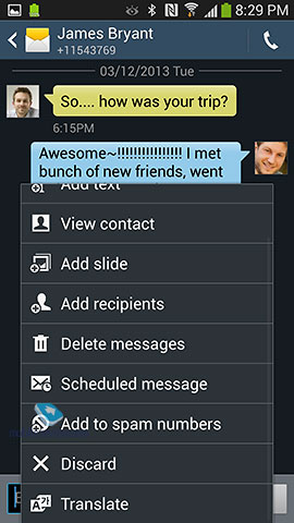 S Translator и S VoiceК сожалению, переводчик текстов и голоса будет не актуален для России, как минимум, до конца ноября 2013 года, так как в программе не поддерживается русский язык. Это приложение намного важнее, чем кажется на первый взгляд, попробую описать его. В окошке вы можете написать текст и тут же получить его перевод. Вы можете надиктовать текст и получить перевод. Аналогичные функции есть у Google, и они работают отлично, хоть и не стали популярны. Пока не стали. Важность решения от Samsung в том, что используя движок от Google (но можно вставить и любой иной), добавили возможность перевода в стандартных приложениях. Например, в SMS-сообщениях вы можете переводить тексты с одного языка на другой. То есть, если раньше, переписываясь со знакомым из другой страны, вы были ограничены английским или тем языком, что знаете вы оба, то отныне это может быть любой из языков. То есть, в будущем мы получаем средство, с помощью которого можно писать SMS на родном языке, а человек будет читать его на своем. Конечно, это не идеальный переводчик, но направление развития технологий меня откровенно радует. Напомню, что в S Voice есть русский язык (об этом многие не знают), и программа также немного видоизменилась, поумнела. Но это также тема отдельного разговора в подробном обзоре.
