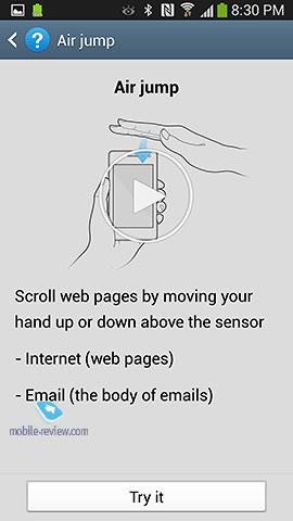 Управление жестами – Air GestureМожно, не прикасаясь к экрану, перелистывать картинки в галерее, передвигаться по списку и делать тому подобные простые вещи. Разницы с прикосновением к экрану нет никакой, и старый способ общения с ним даже удобнее. Но, возможно, кому-то будет интересно показать, что в этом телефоне возможно и так. К моему удивлению, большая часть подобных фишек вводится не для зрелых потребителей, а для школьников, которые любят показывать, как их телефон умеет работать. Тут важно понимать, что дети быстро осваивают такие способы управления, и со временем они могут стать стандартными, а мы со своими воззрениями и привычками несколько устареем. Но пока можно говорить о том, что это баловство, как и управление похлопыванием, которое есть в телефонах Samsung давно, но так и не стало массово применимым.