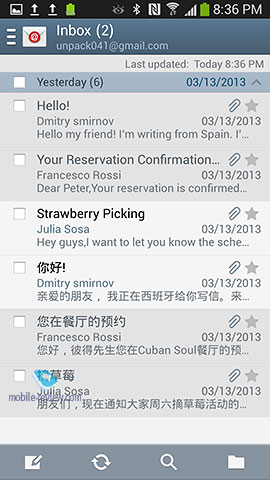 Сообщения и электронная почтаВ SMS появилась возможность видеть иконки людей в списке, что не так уж важно. Мне понравилась функция отправки SMS-сообщения по расписанию – уезжаешь в командировку и в самолете пишешь море SMS, которые потом отправляются родителям в заданное время. Или хотите поздравить человека с днем рождения, но боитесь забыть или заснуть. Одним словом, функция полезная и на практике будет пользоваться популярностью. Клиент электронной почты сильно переработан. Появились фильтры, которые вы можете настраивать самостоятельно, Есть представление в виде разговора и еще ряд “мелочей”. Довольно функциональное решение.
