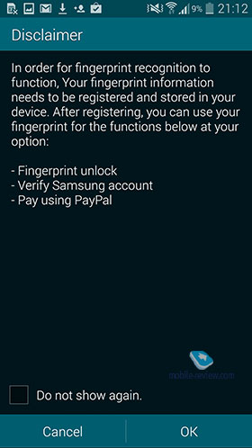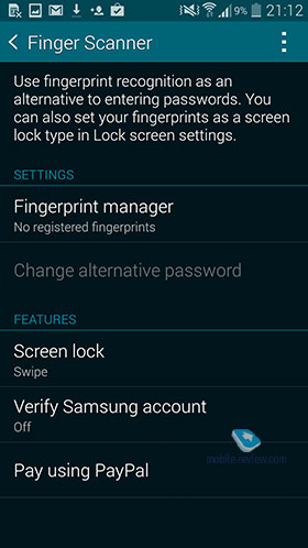 Еще в комплект бесплатных программ входят игрушки, некоторые утилиты, но считать их нет смысла, так как их стоимость составляет по нескольку долларов, на фоне вышеупомянутых предложений это не так важно. Поместив в начало описание этих дополнительных сервисов и программ, я хочу подчеркнуть то, что это достаточно интересное предложение, которое становится для Samsung одним из ключевых в продвижении своих устройств. Покупая флагман, вы получаете довольно полезные утилиты и сервисы бесплатно. Что-то вам подойдет, что-то нет – но они повышают привлекательность устройства для пользователя. Например, я активно использую DropBox, так как он удобен для моих целей и позволяет хранить все мои фотографии, которых за год набирается более 10 000 только на телефоне. Обновленная версия TouchWiz – интерфейс, рабочие столы, фишкиВ продуктах Samsung используется фирменная оболочка TouchWiz, которая претерпела в S5 сильные изменения – она становится все более схожей с фирменным UI от Google, а также взят курс на интеграцию всех возможностей в единое представление. Многие функции, которые мы видим в S5, в будущем появятся в том или ином виде и в «голом» Android. Фишкой S5, которая будет скопирована во многих моделях компании, за исключением среднего и бюджетного сегментов, стал экранный сенсор отпечатков пальцев. Это дополнительная возможность разблокировки аппарата – помимо распознавания лица, геометрического узора, алфавитно-цифрового пароля. Всего можно зарегистрировать до трех отпечатков пальцев, в заблокированном состоянии достаточно провести по середине экрана и задеть физическую кнопку. Сенсор работает практически моментально, особой разницы в быстродействии с iPhone 5s, где также есть подобный сенсор, мне заметить не удалось. Отличие от iPhone в том, что тут надо проводить пальцем, в то время как там палец достаточно прикладывать.