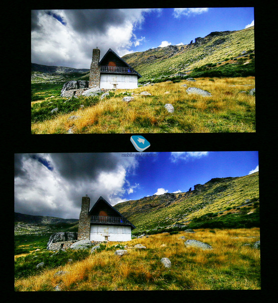Очень рекомендую прочитать большое и профессиональное исследование экрана в этом аппарате от Display Mate, по его итогам экран в телефоне признан лучшим в мире среди всех смартфонов. Если просто сравнить его с iPhone 6 (сверху), то быстро выяснится, что количество отображаемых точек на Iphone 6 меньше в 4 раза, хуже яркость, углы обзора не так хороши и так далее. Это продукты разного уровня – с одной стороны лучший в мире экран, с другой – просто хороший дисплей.