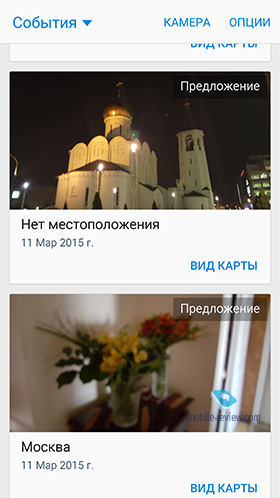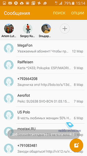 Номеронабиратель и контакты. Набирая номер, вы можете быстро вызвать контакт, достаточно правильно ввести первые цифры или буквы имени, фамилии. В списке появятся совпадения. Журнал вызовов имеет фильтр по типу звонков. Также как и на предыдущих моделях, можно провести по имени влево или вправо, чтобы отправить сообщение или позвонить, эту настройку можно отключить, но она многим пришлась по душе. В избранном, помимо выбранных контактов, есть также список номеров, которые вы часто используете. При звонке показывается информация, связанная с контактом, последние SMS, почта, события из календаря. В списке контактов можно листать имена по буквам алфавита (первым идет русский, потом латиница). Изменения исключительно визуальные, UI стал проще и легче, но функциональность сохранили на уровне предыдущей версии TouchWiz. Многим это кажется неправильным, но вопрос исключительно вкуса и привычки.