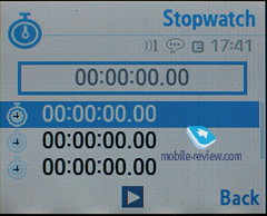 Проигрывание может идти как через стереогарнитуру, так и через громкую связь. Громкость имеет 14 градаций. Пользователь может создавать свои плей-листы (формирование из 4 предустановленных). Плеер работает в фоновом режиме. Будильник. В телефоне всего пять будильников, каждый можно выставить на рабочие дни недели (есть выбор конкретных дней) или на однократное срабатывание. Для всех есть выбор из стандартных мелодий, но можно использовать и mp3. В настройках можно указать, будет ли телефон включаться автоматически при наступлении события или нет.