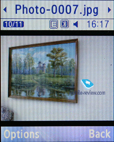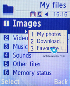 ![]() File Manager (My files). That’s the place to search for all files such as music, pictures, video and sounds. Any uploaded file gets stored here. The disadvantage is that files sometimes are not displayed in the list immediately - in that case you will need to leave the menu and enter it again. Files and folders can be viewed either as a list or thumbnails. You can mark any number of files. The handset supports Move, Copy and Delete operations, as well as various types of sorting (by type, name or size). Memory card’s file structure is a slightly different story, as it can be accessed through the main menu, where each item features “Memory card” option.