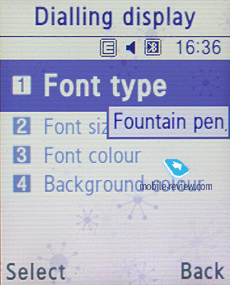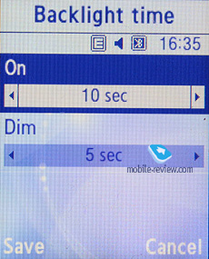![]() Back to the table of contents >>> Settings. Traditionally this item boasts a standard set of options inside like password protection of selected sections (messages, short messages, organizer, etc.), backlighting duration and brightness, dialing display settings.