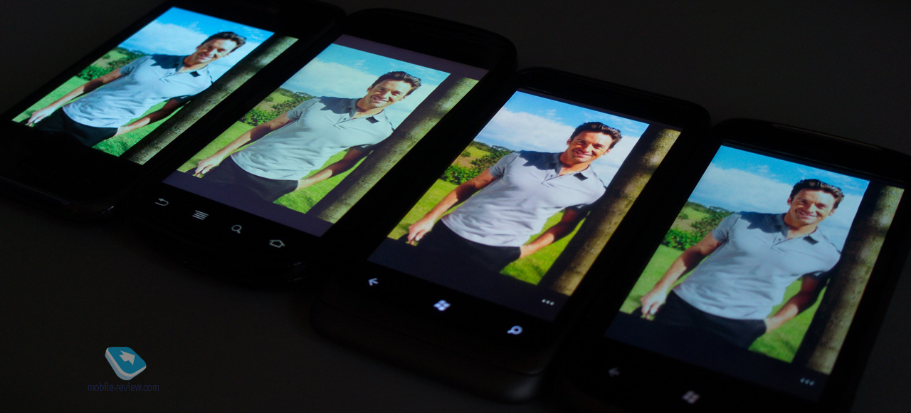 Углы обзора дисплея большие, под наклонами немного падает яркость. В отличие от SuperAMOLED (в Nexus S i9020 и Samsung Galaxy i9000) глубина черного цвета очень маленькая: вместо естественного черного дисплей светится фиолетовым. Это сильно заметно как на фотографиях, так и в меню. Не хочется вступать в «холивар», но мне ближе SA-матрица, пусть и выполненная по PenTile-технологии (особое построение пикселей). Ниже сравнение под микроскопом S-LCD и SA: ![]() Исходя из изображения, можно сделать вывод, что S-LCD-матрица отображает текст более гладко. ![]() Яркость подсветки высокая, регулируется вручную или автоматически при помощи датчика освещения. Цветопередача неплохая. При сравнении дисплеев, представленных ниже, экран Google Nexus i9023 уводит в желтые оттенки. На солнце практически не выцветает. ![]() Дисплей Samsung i9000 (слева), Nexus S, HTC Radar и HTC Mozart (справа):