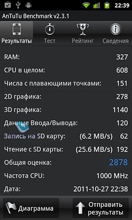 AnTuTu Benchmark НавигацияВ аппарате присутствует GPS. Для навигации используются «Карты» (Google Maps), «Локатор» и «Навигатор». Поиск спутников осуществляется в «холодном» старте за 30-40 секунд, в «горячем» - менее пяти секунд.