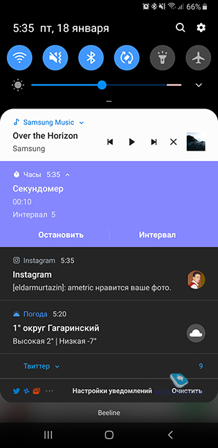 Многие приложения могут работать в шторке, например, это музыкальный плеер, секундомер, и они хорошо выделяются цветом и положением.